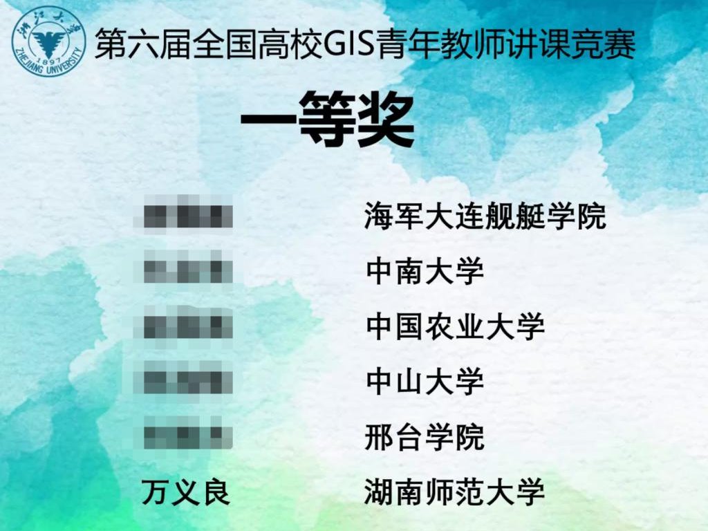 8月3日- 4日,由中国地理信息产业协会、中国地理学会、浙江大学、南京师范大学主办,中国地理信息产业协会教育与科普工作委员会、中国地理学会教育工作委员会、浙江大学地球科学学院承办的第六届全国高校GIS青年教师讲课竞赛,经过两天的紧张赛程在浙江杭州圆满结束。威尼斯官网青年教师万义良老师代表湖南师范大学参赛,荣获第六届全国高校GIS青年教师讲课竞赛一等奖。